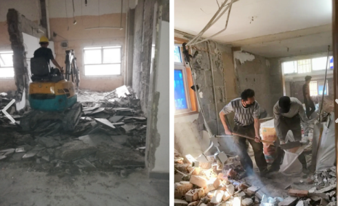 2拆除室内各种墙体,隔断,棚顶,吊顶,地面垫层,砸墙砖、砸地砖。